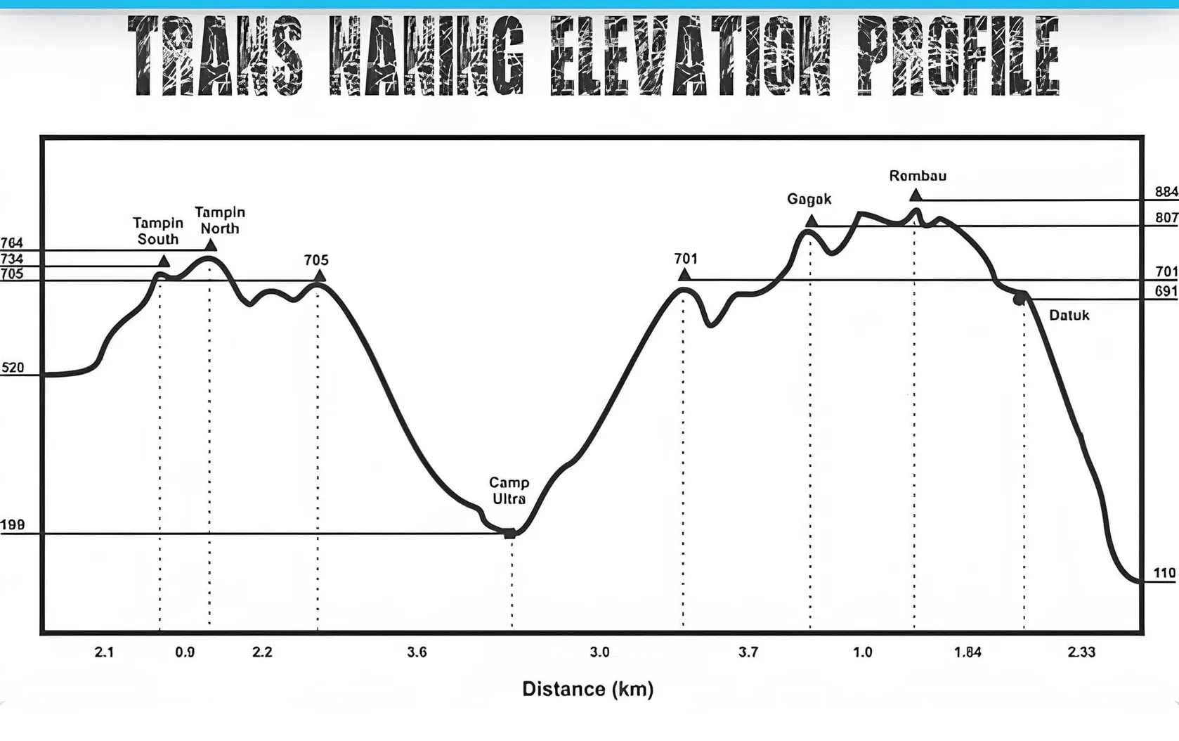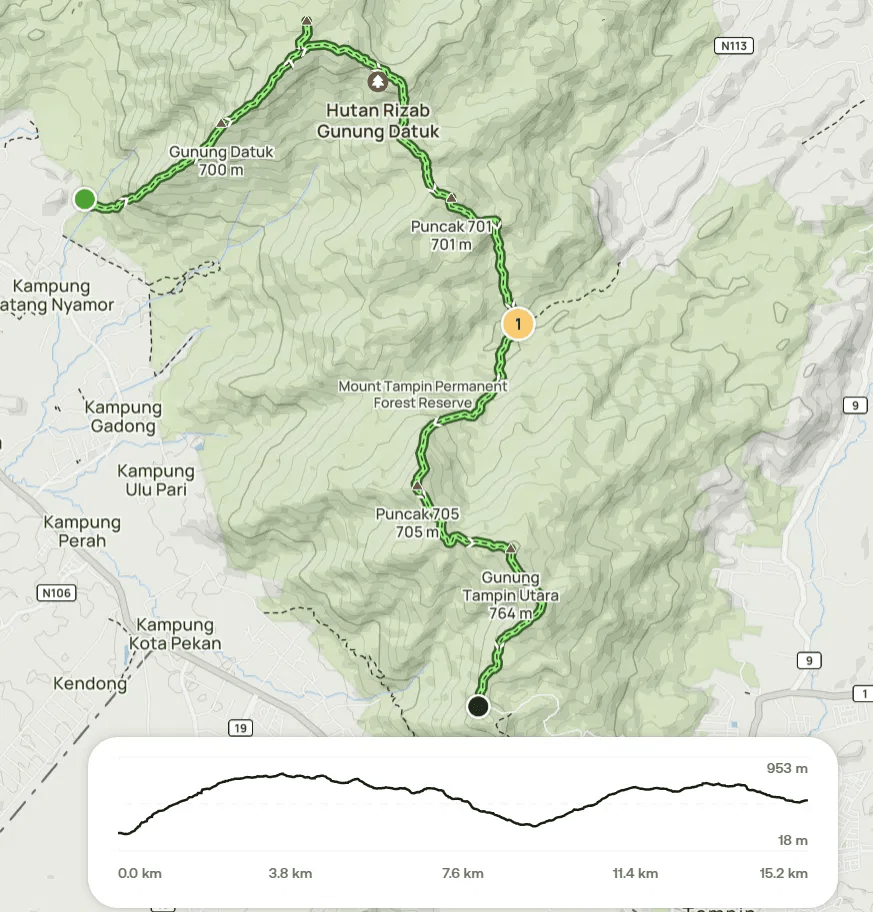 The full trail traverses seven peaks, namely Gunung Datuk > Gunung Rembau > Gunung Gagak > Puncak 701 > Puncak 705 > Gunung Tampin Utara > Gunung Tampin Selatan.